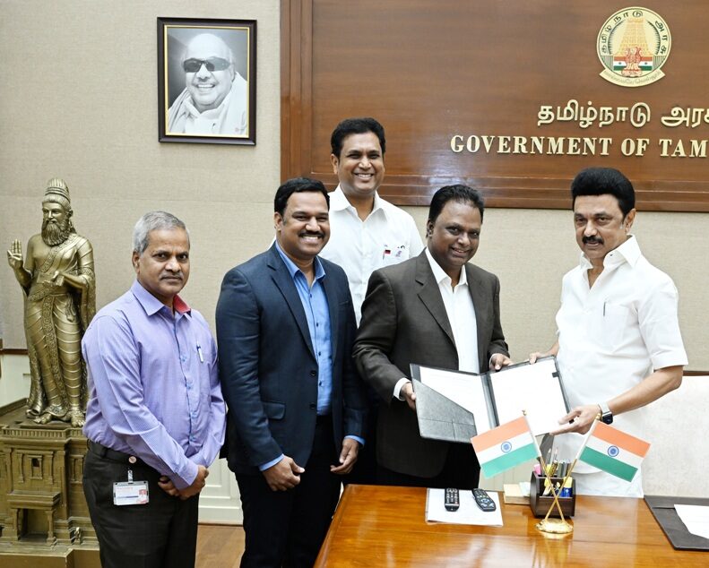 காசோலையை வழங்கினார். உடன் மாண்புமிகு தொழில், முதலீட்டு ஊக்குவிப்பு மற்றும் வர்த்தகத் துறை அமைச்சர் முனைவர் டி.ஆர்.பி. ராஜா, மகேந்திரா ஆராய்ச்சி கூடத்தின் துணைத் தலைவர்கள் திரு. மதன்ராஜ் மற்றும் திரு. சக்திவேலன் ஆகியோர் உள்ளனர்.