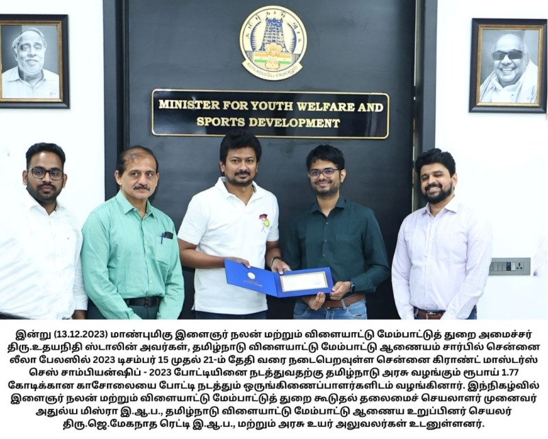 ‘சென்னை கிராண்ட் மாஸ்டர்ஸ் செஸ் சாம்பியன்ஷிப் 2023’-தமிழ்நாடு அரசு வழங்கும் ரூபாய் 1.77 கோடிக்கான காசோலையை போட்டி நடத்தும் ஒருங்கிணைப்பாளர்களிடம் அமைச்சர் திரு.உதயநிதி ஸ்டாலின் வழங்கினார்.