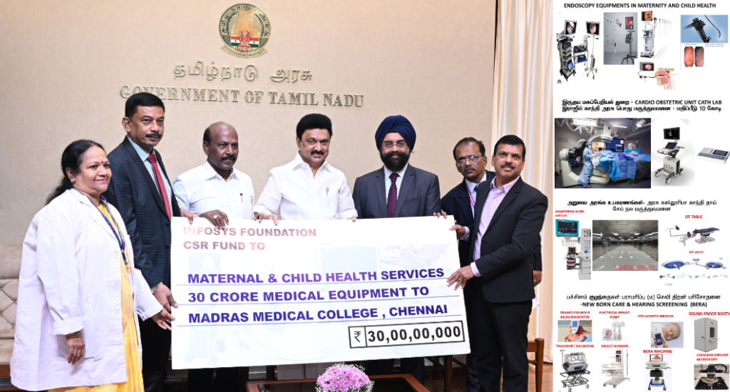 இன்போசிஸ் நிறுவன அறக்கட்டளையின் சமூகப் பொறுப்பு நிதியிலிருந்து 30 கோடி ரூபாய் மதிப்பிலான மருத்துவ உபகரணங்களை இராஜீவ் காந்தி அரசு பொது மருத்துவமனை மற்றும் அரசு கஸ்தூரிபா காந்தி தாய் சேய் நல மருத்துவமனைகளின் பயன்பாட்டிற்காக வழங்குதல்