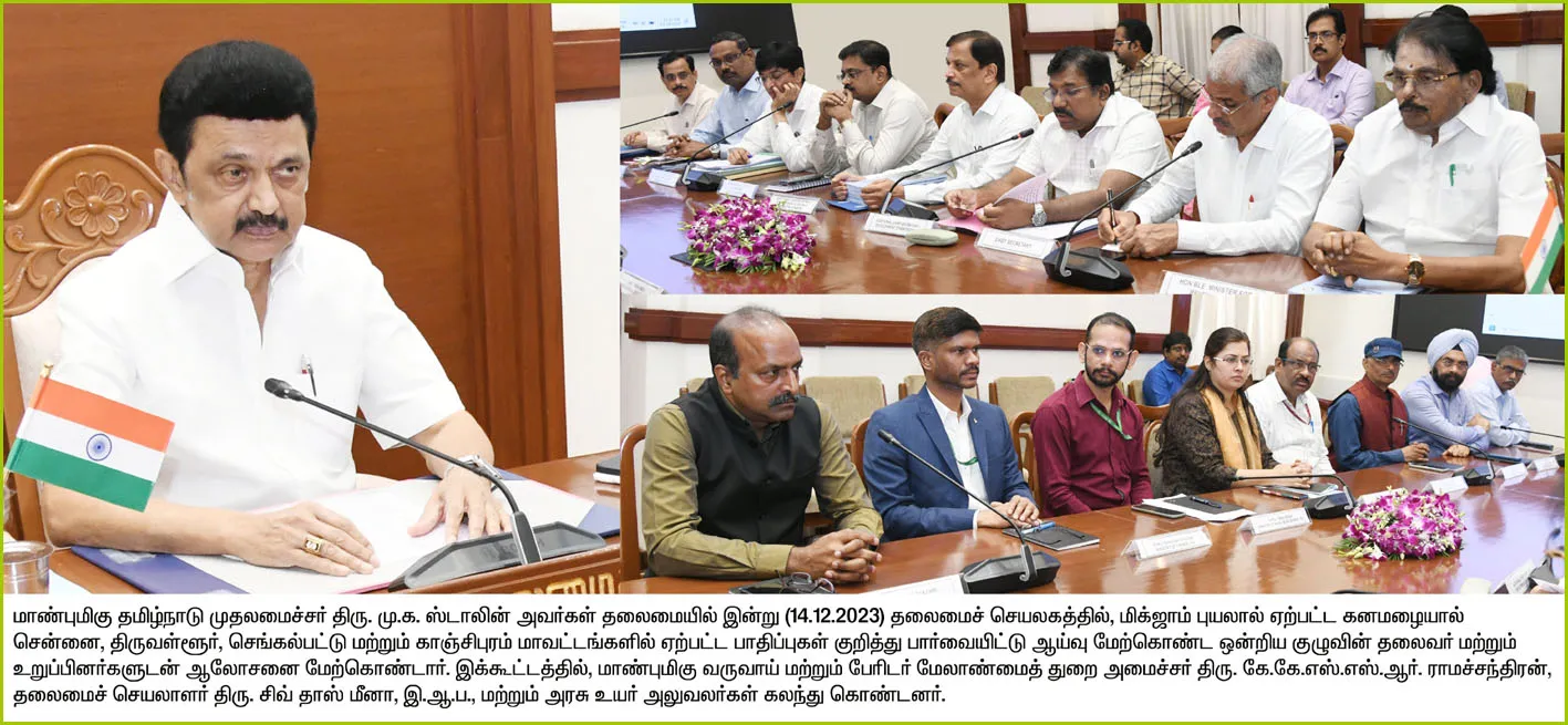 மாண்புமிகு தமிழ்நாடு முதலமைச்சர் திரு. மு.க. ஸ்டாலின் அவர்கள் இன்று (14.12.2023) தலைமைச் செயலகத்தில், மிக்ஜாம் புயலால் ஏற்பட்ட கனமழையால் சென்னை, திருவள்ளூர், செங்கல்பட்டு மற்றும் காஞ்சிபுரம் மாவட்டங்களில் ஏற்பட்ட பாதிப்புகள் குறித்து பார்வையிட்டு ஆய்வு மேற்கொண்ட ஒன்றிய குழுவின் தலைவர் மற்றும் உறுப்பினர்களுடன் ஆலோசனை மேற்கொண்டார்.
