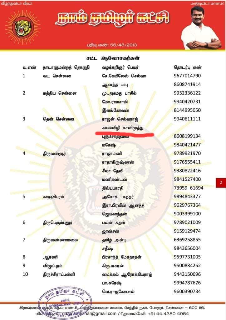 நாடாளுமன்ற தேர்தலுக்காக மாநிலம் முழுவதும் தொகுதி வாரியாக சட்ட ஆலோசகர்கள் நியமித்து அறிவிப்பு வெளியாகியுள்ள நிலையில், தென்சென்னை தொகுதி சட்ட ஆலோசகராக கயல்விழி சீமான் நியமனம்.