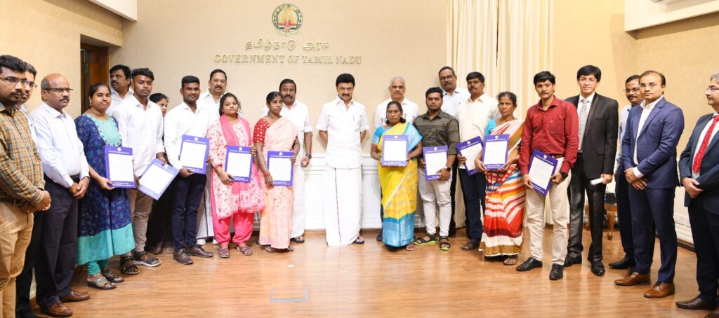 நகராட்சி நிர்வாக இயக்ககத்தில் பணிக்காலத்தில் உயிரிழந்த 68 பணியாளர்களின் வாரிசுதாரர்களுக்கு இளநிலை உதவியாளர் / வருவாய் உதவியாளர், அலுவலக உதவியாளர், பணி ஆய்வர், தொழில்நுட்ப உதவியாளர் ஆகிய பணியிடத்திற்கு கருணை அடிப்படையில் பணி நியமன ஆணைகளை வழங்கிடும் அடையாளமாக 6 நபர்களுக்கும் தமிழ்நாடு முதலமைச்சர் அவர்கள் பணிநியமன ஆணைகளை வழங்கினார்.